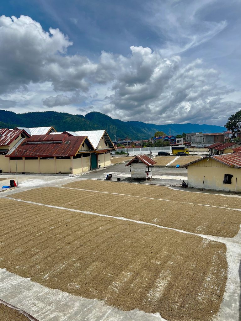Each producer carefully sorts their harvested cherries and delivers them to a centralized mill to be depulped and fermented overnight. Then the coffee is washed and laid out on patios to shed the excess water from the parchment covered beans. Next the coffee takes a detour from the conventional path of processing in other origins, wherein, the coffee parchment is removed while the coffee still has a high moisture content. This wet-hulling process, called Giling Basah in the Indonesian language, leaves the coffee bean exposed while drying on patios to a moisture percentage acceptable for export. This Indonesian processing method gives the bean its unique bluish color and the hallmark Indonesian profile.