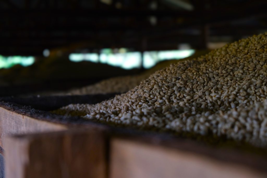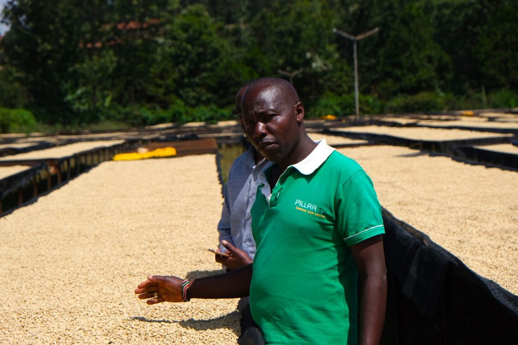 Kii typically ferments for 16-18 hours depending on ambient conditions (the changing mountain climate, as for many processors, tends to dictate fermentation temperatures, and processing staff are required to check fermentation progress every three hours). After fermentation, the parchment is washed clean in long cement channels using fresh running water, a step that also allows the denser, heavier parchment to separate from the rest. After washing and grading is complete, the parchment is moved to the factory’s raised tables to dry, typically for two weeks. After drying is complete the coffee is conditioned in large, perforated bins on site to allow moisture to stabilize, preparing the coffees for transit and a long shelf life. The established milling and sorting by grade, or bean size, is a longstanding tradition and positions Kenya coffees well for roasters, by tightly controlling the physical preparation and creating a diversity of profiles from a single processing batch.
