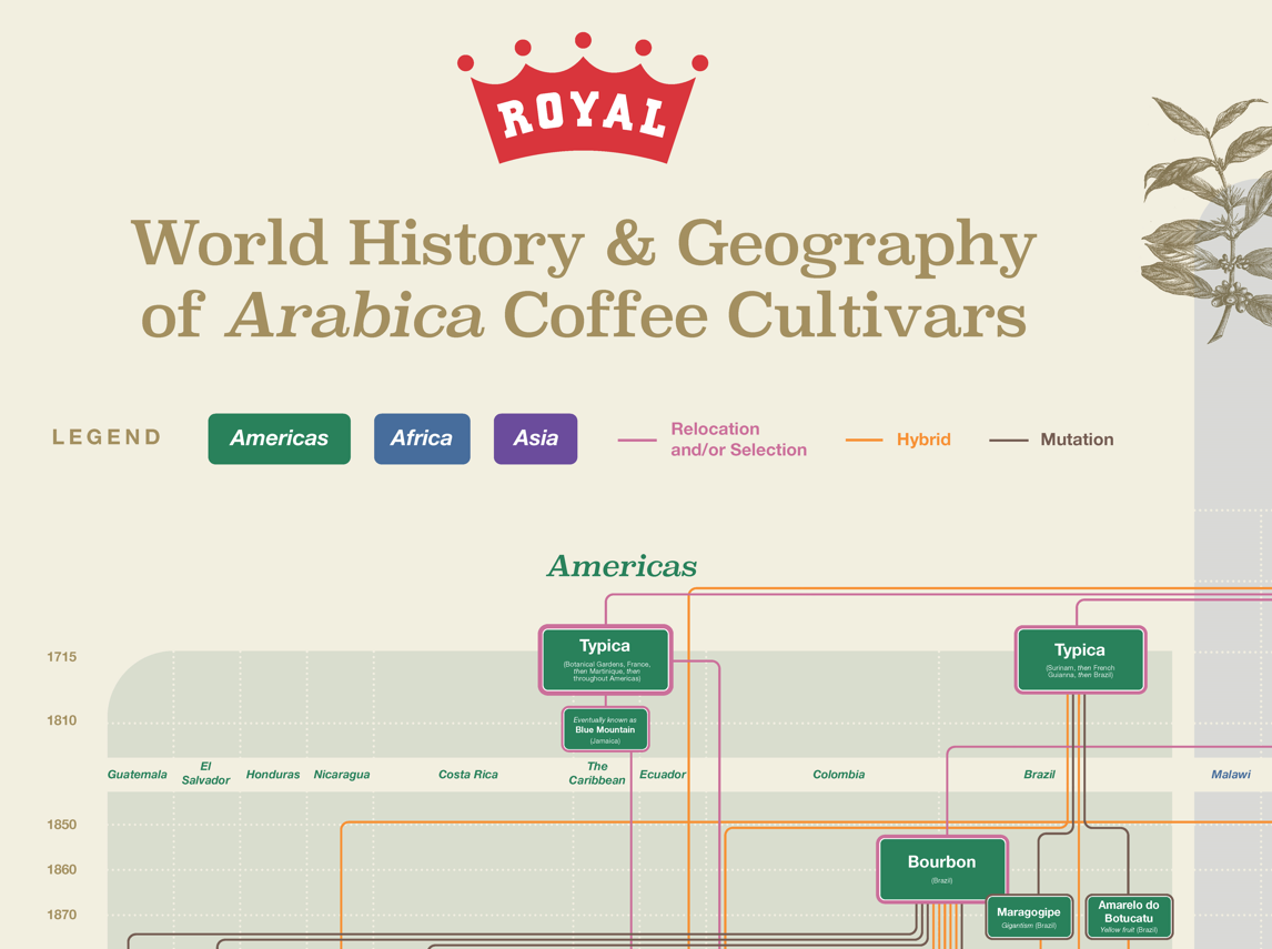 The coffee family tree gets a major overhaul in Royal Coffee’s new and improved genetic map of Arabica’s most famous global cultivars in a newly released infographic entitled World History and Geography of Arabica Cultivars.