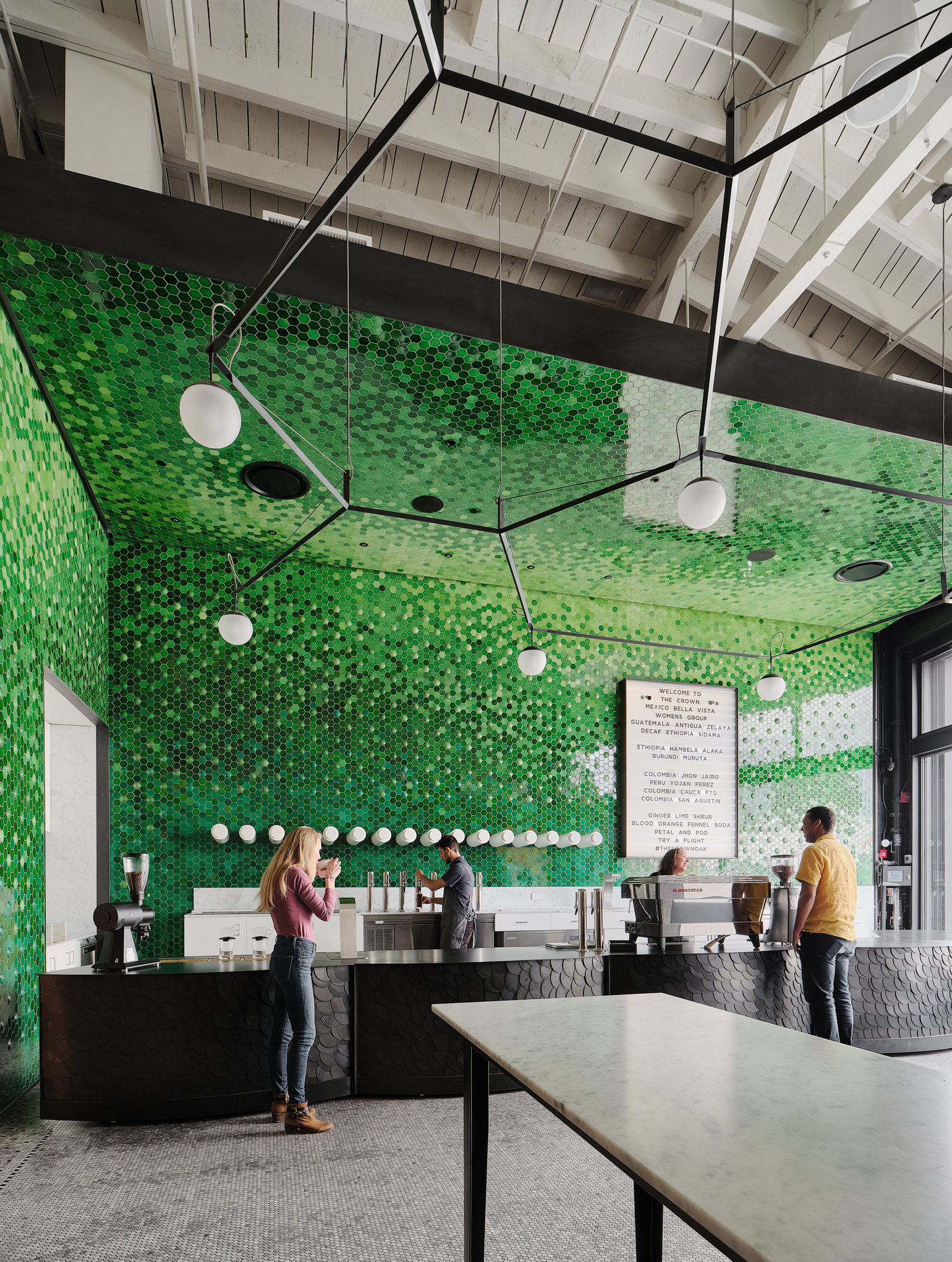 All guests enter The Crown via our Tasting Room. This room features the opportunity for stellar coffee service, diverse counter heights for drinks & light bites, an expansive 8-tap system, and a mobile modular coffee bar, called “Naaga”, built by Oakland artist Chambers Art & Design.