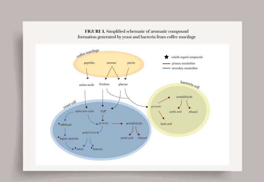 Yeast utilizes sugar to generate aroma-influencing molecules through two pathways, central carbon and nitrogen metabolism. (See Figure 1, page XX.) Pectin present in mucilage is broken down through the facilitation of water via hydrolysis which is then consumed by yeast. In turn, this releases simple sugars that act as an additional carbon source for yeast metabolism and aromatic formation. Yeast produces primary metabolites (alcohol) and secondary metabolites, which are the desired aromatics (esters, etc.). The microbial activity step in post-harvest natural processing allows glucose and fructose to be pulled out of the seed and provides even more nutrients for bacteria and yeast to feed on. It has been found that wet processing had higher concentrations of Lactococcus, which is a typical bacterium of milk and fermented dairy products. In another article published in Applied and Environmental Microbiology, this one titled “Exploring the Impacts of Postharvest Processing on the Microbiota and Metabolite Profiles during Green Coffee Bean Production” and published in 2016, glucose and fructose were confirmed to be lower in wet-processed coffees, suggesting that this type of post-harvest processing reduces the microbes’ sugar metabolism and alters the aromatics. Citric acid, which presents as bright and sharp (orange and lemons), is typically found to be higher in washed coffees. Candida, a type of bacteria that produces citric acid is found in higher concentrations during the soaking stage. This aligns with the general agreement that wet-processed coffees are found to have higher acidity. These are just a few highlights of the abundantly diverse microbial community structure.