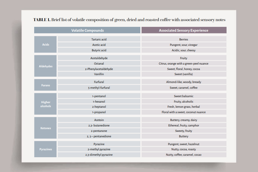 Certain esters have been shown to contribute to the development of highly sought-after exotic sensory notes such as apricot and rose. Lactic acids discussed earlier as being more prevalent in dry processed coffees, can also be utilized for ester fermentation. According to the literature review published in Food Chemistry in 2019, cited previously, “Aldehydes are also generated during mucilage removal and serve an important purpose in aromatic compounds like higher alcohols and esters.” Table 1 (page XX) displays a brief list of volatile compounds and their associated aroma perceptions in green and roasted coffee. This is a long list, but it just scratches the surface of the compounds responsible for the sensory experience of coffee.
