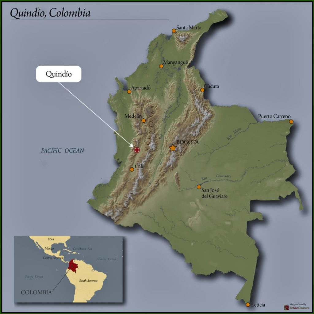 For such a naturally gifted department as Quindío, it tends to receive less recognition than others for its coffee. Quindío is Colombia’s second-smallest department by size, making up only about 0.2% of the national territory. It’s location, however, right on the central cordillera of Colombia’s vast Andes divide, and centrally between the country’s largest and most influential cities (Bogotá, Medellín, and Cali), give it a high volume of tourist traffic, coffee industry, airline commuters, and idyllic getaways in the form of brightly painted mountain towns, natural reserves, and high elevation tropical landscapes throughout. Almost the entire department is mountainous, its lowest elevations still over 1000 meters, and many parts are dense with coffee plantations, from the small to the large and ambitious.